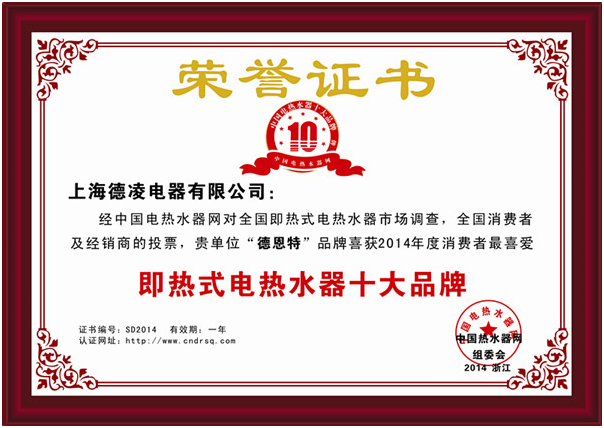 上海德凌電器有限公司經(jīng)中國電熱水器網(wǎng)對全國即熱式電熱水器市場調(diào)查,全國消費(fèi)者及經(jīng)銷商投票,“德恩特”品牌喜獲“2014年度消費(fèi)者最喜愛即熱式電熱水器十大品牌”并連續(xù)4年獲得排名第一。