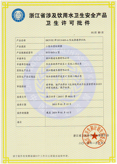 • 德恩特凈水機已獲得國家衛生許可批件